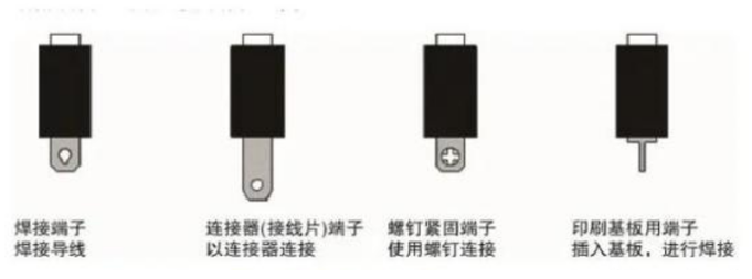 具有連接開關(guān)和外部電路的作用,根據(jù)連接方法,可以分為焊接端子、接線片端子、螺釘緊固端子、印刷基板用端子。(圖5)