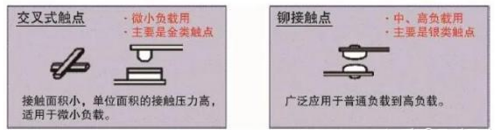 觸點(diǎn)部是微動(dòng)開關(guān)的心臟部分,通過觸點(diǎn)進(jìn)行電路的ON/OFF。根據(jù)ON/OFF的電壓及電流,采用不同的觸點(diǎn)材料及形狀。材料主要以金、銀及其合金以及金銀電鍍?yōu)橹?。形狀有交叉式觸點(diǎn)、鉚接觸點(diǎn)等(圖4)。